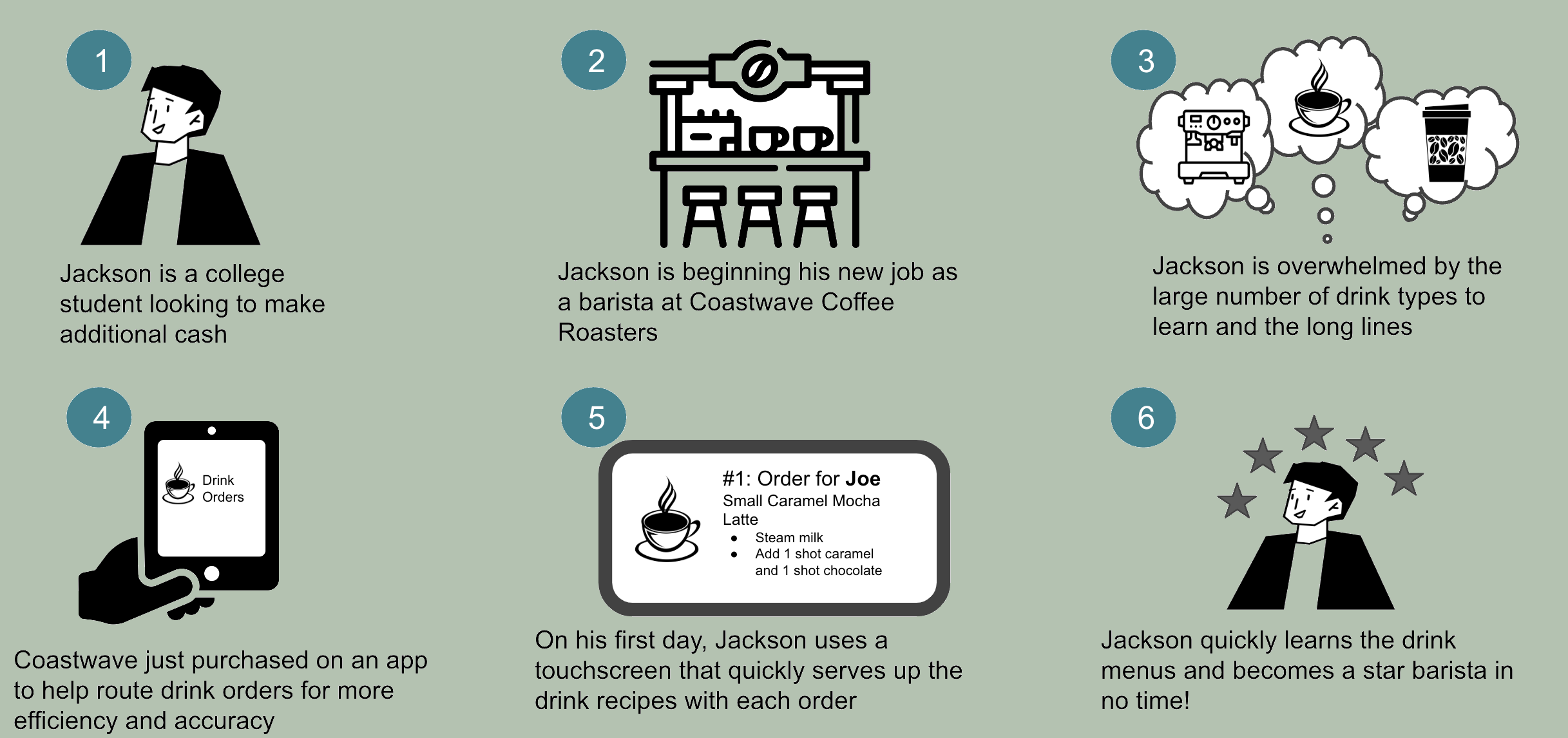 Here’s an example using the user narrative process to tell the store of an in store mobile solution. Of course, when presenting the story live, you’ll have lots of opportunity to elaborate and embellish the details.