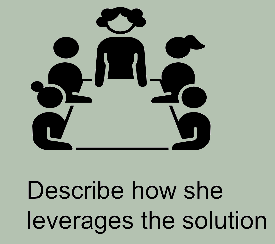 How does your character leverages your solution? Focus on demonstrating the solution in action. Include details such as solution discovery, how it fits into your persona’s environment, and how it is being used.