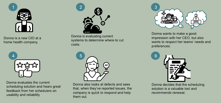 Start with your lead actor - your persona. Create a persona that reflects a typical beneficiary of your product or solution investment. Your persona doesn’t have to be an end user, they can reflect anyone in the value chain - implementer, buyer, even a sales or support person! But make them relatable by giving them a name and a bit of a backstory. Don’t go crazy - a few lines of introduction will suffice!